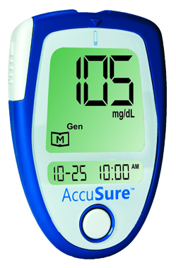 AccuSure Blue Glucose Monitoring System Just insert the strip to start, apply blood, and results in just few seconds. No need to change the code (No Code Required).